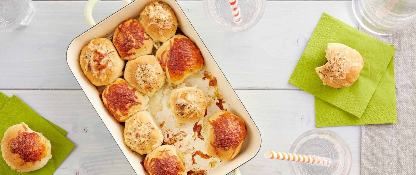 Maak een balletjes van de vierkantjes en plaats in een ingevette schaal. Bestrooi de balletjes afwisselend met Emmentaler en gedroogde kruiden, en mozzarella.